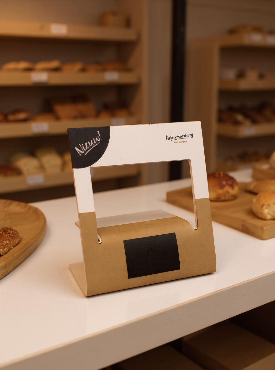 We zoeken een leuke, gepersonaliseerde display die ik op of in de toonbank kan zetten om een pistolet of een lekkere koek extra in de spotlight te zetten. Hij mag echt opvallen in de winkel en ik zou er graag een eigen, korte tekst op willen laten zetten om het helemaal af te maken.